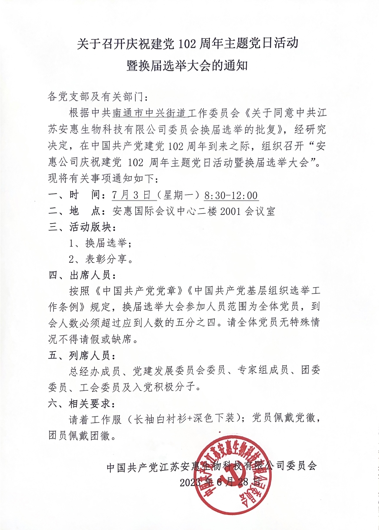 關(guān)于召開(kāi)慶祝建黨102周年主題黨日活動(dòng)暨換屆選舉大會(huì)的通知